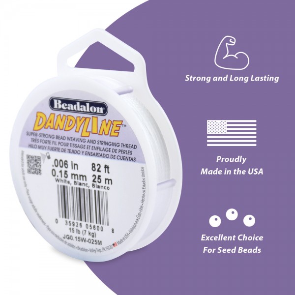 Ideal for stitching and detailed beadwork, DandyLine is a braided thread that provides maximum strength and flexibility for any bead stringing and bead weaving project. It is made specifically for beading using an advanced synthetic material, called Spectra®, that provides extreme softness, flexibility, and near zero stretch. DandyLine is 100% water proof and will not stretch, and is an excellent choice for Toho or Miyuki/Matsuno Seed Beads. Use Hard Beading Needles for smaller diameters and Collapsible Eye Needles for larger diameters. Also excellent for use on diamond beads - we suggest knotting for extra security. Made in USA by Beadalon.