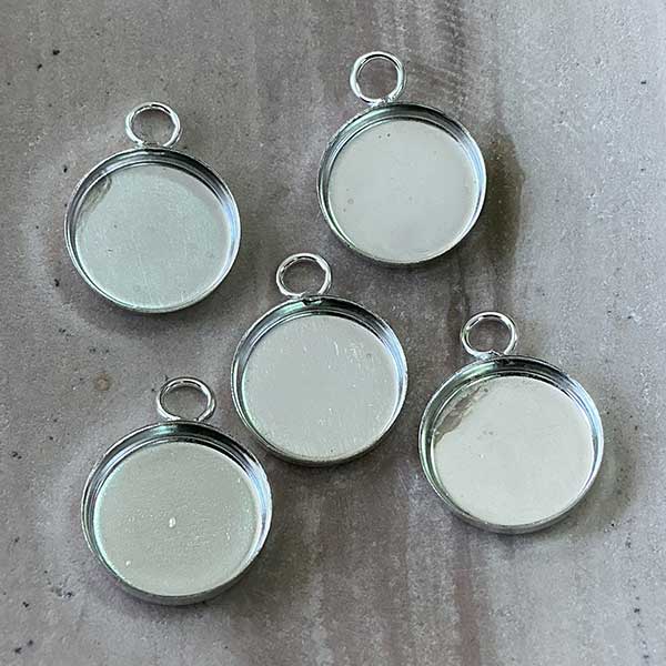 Lightweight Silver Plated Brass Bezel Cup Trays with Loop - measure 12.5mm outer diameter (11mm ID) with 2mm loop. Depth of cup approx 2.5mm. Great for resin, polymer clay and mixed media pendant designs.