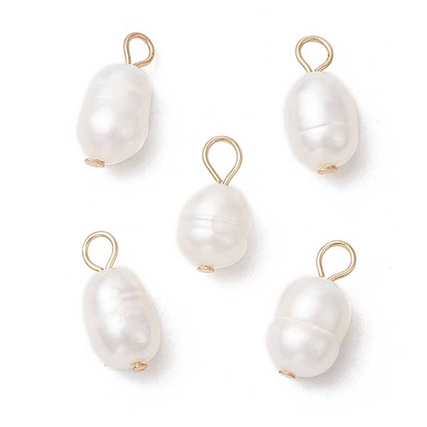 Grade B Natural Cultured Freshwater Rice Pearl Charms, with Gold Plated 304 Stainless Steel Jump Rings.