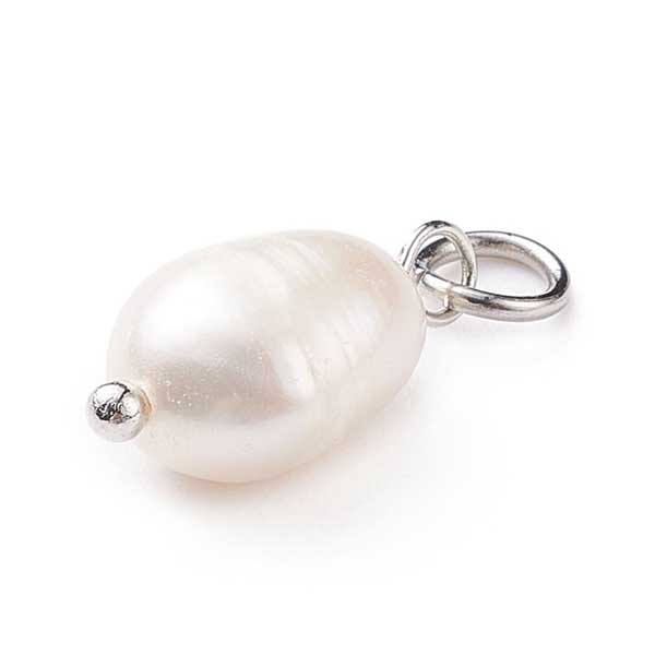 Grade B Natural Cultured Freshwater Rice Pearl Charms, with Platinum Silver Plated Cap, 304 Stainless Steel Jump Rings & Ball Tipped Headpin through centre.