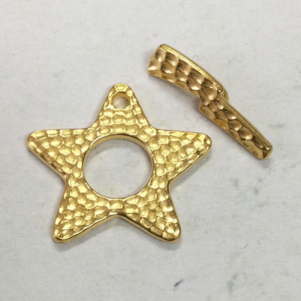 This lovely Hammertone Star Toggle Clasp makes a stylish closure for necklaces & bracelets. Made from finely cast pewter plated with 22K Bright Gold electroplating over nickel safe, lead & cadmium free pewter. Star Measures 25mm Diameter. Best quality - Made in USA.