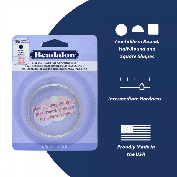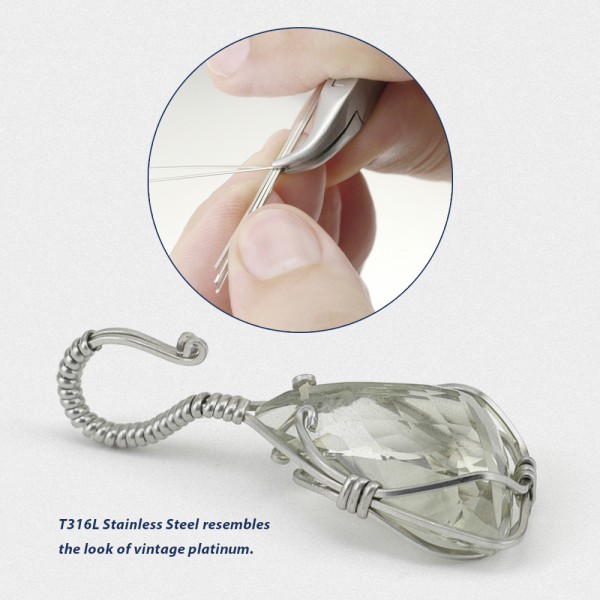 Made of Type 316L Stainless Steel, this specially tempered wire has a different “feel” than other half-hard materials such as Gold-filled or Sterling Silver, however it is a great alternative and is stronger. This material is perfect for teaching classes and practice. Ideal for all types of wire-wrapping, weight-bearing designs, and holding designs together. Stainless Steel is harder and will work harden faster than other wires, and resembles the finish of vintage platinum.