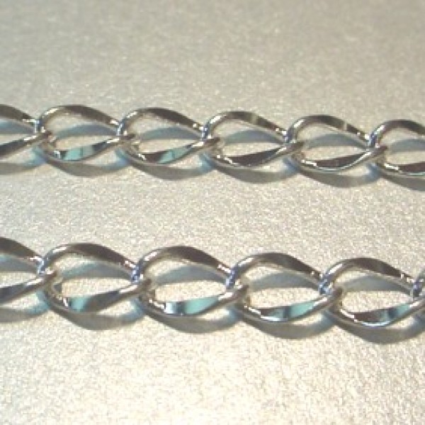 6x8.8mm hammered curb chain. This imported brass footage chain is made of soldered links. Silver Plated (Sterling Silver colour).