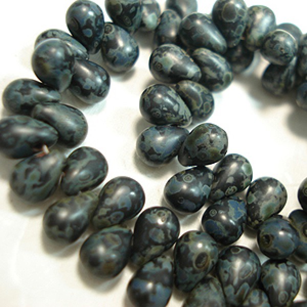 Gorgeous Czech Top-Drilled Drops in Matte Jet-Picasso. Measuring 4x6mm.
