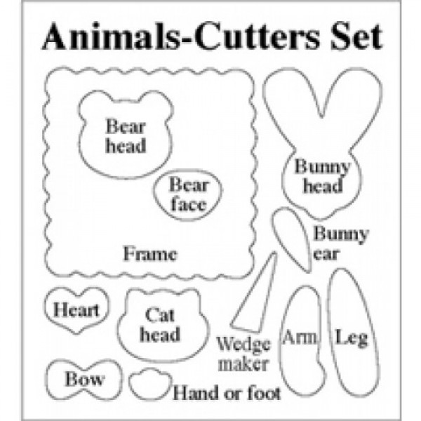 This package contains 12 cutters with an animal theme. Includes a rabbit, bear and cat cutter shapes with ear, leg, arm, hand face and other cutters including heart, wedge and bow shapes. For shape details, please refer to graphic.