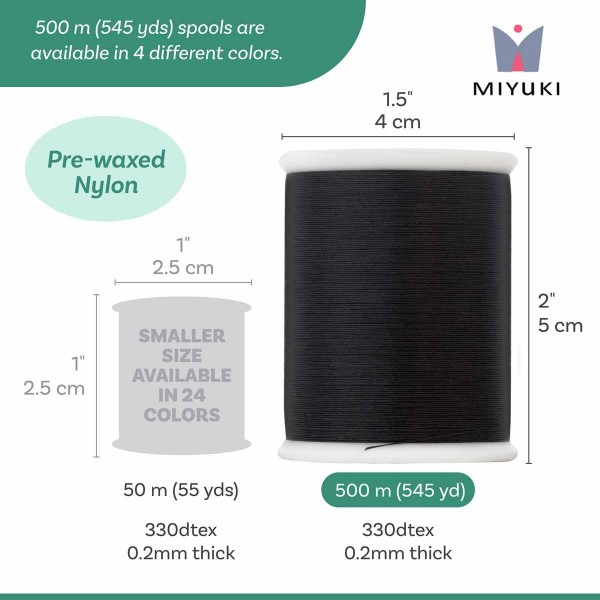 Miyuki Nylon Thread is a pre-waxed beading thread perfect for delicate projects and small-hole beads like seed beads. This fine yet strong beading thread is perfect for techniques that require multiple passes through beads. It is a tangle and fray-resistant thread, simple to work with and easily threads onto a needle. Available in 330 DTEX (0.25mm) and is sold in large 500m spools.